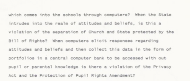 Intrusive questions about the children's families, homes, income, amount of books in the home. This test was an invasive social survey masquerading as a test! It is happening here as well. I have reports from Dothan and Panama City about intrusive social surveys -- and questions about guns.